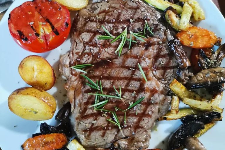 225 gr dana ANTRİKOT pilav yada patates kızartması,köz biber,köz domates,taze sebze ve mantar ile birlikte.. 225 gr veal ANTRİKOT with rice or french fries, roasted peppers, roasted tomatoes, fresh vegetables and mushrooms..