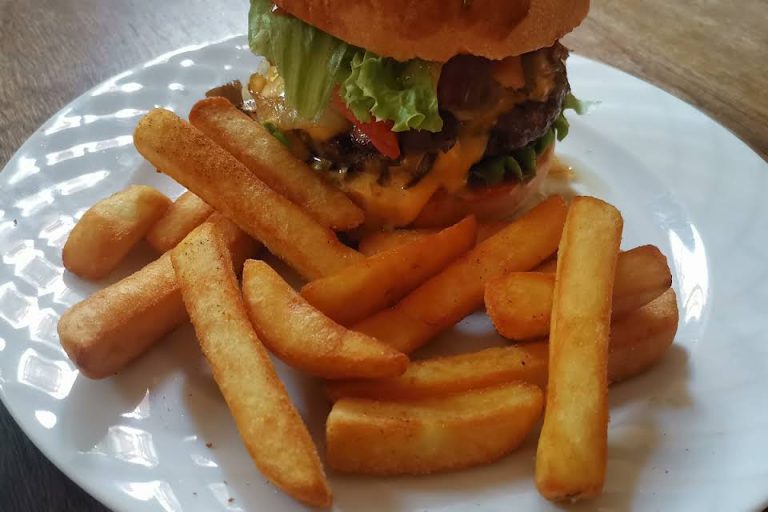 Özel ekmeği,ev yapımı 175 gr köftesi karamelize soğan,mantar,domates,marul.turşu,özel sosu ve kızarmış patates ile birlikte servis edilir. Special bread, homemade 175 gr meatballs are served with caramelized onions, mushrooms, tomatoes, lettuce, pickles, special sauce and fried potatoes.